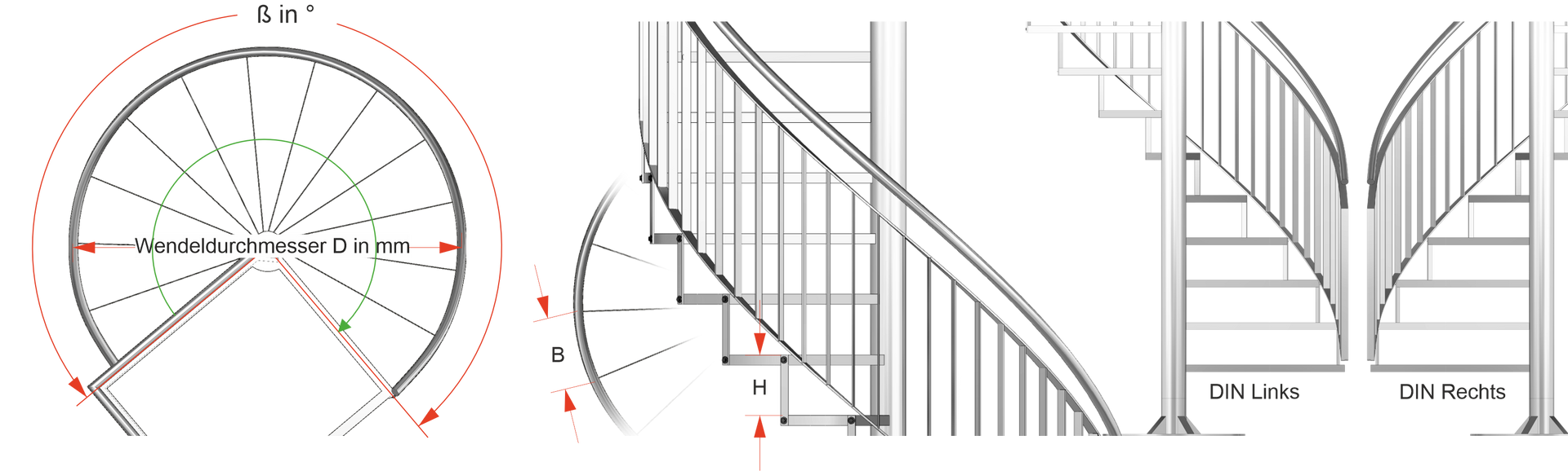 * Der Wendeldurchmesser wird von Mitte Handlauf bis Mitte Handlauf gemessen